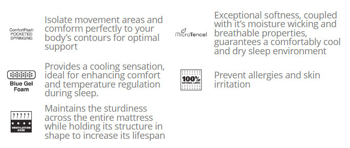 Equipped with Blue Gel Foam, the Ritz Suite delivers a cooling sensation that enhances comfort and regulates temperature, ensuring you stay cool and comfortable throughout the night.